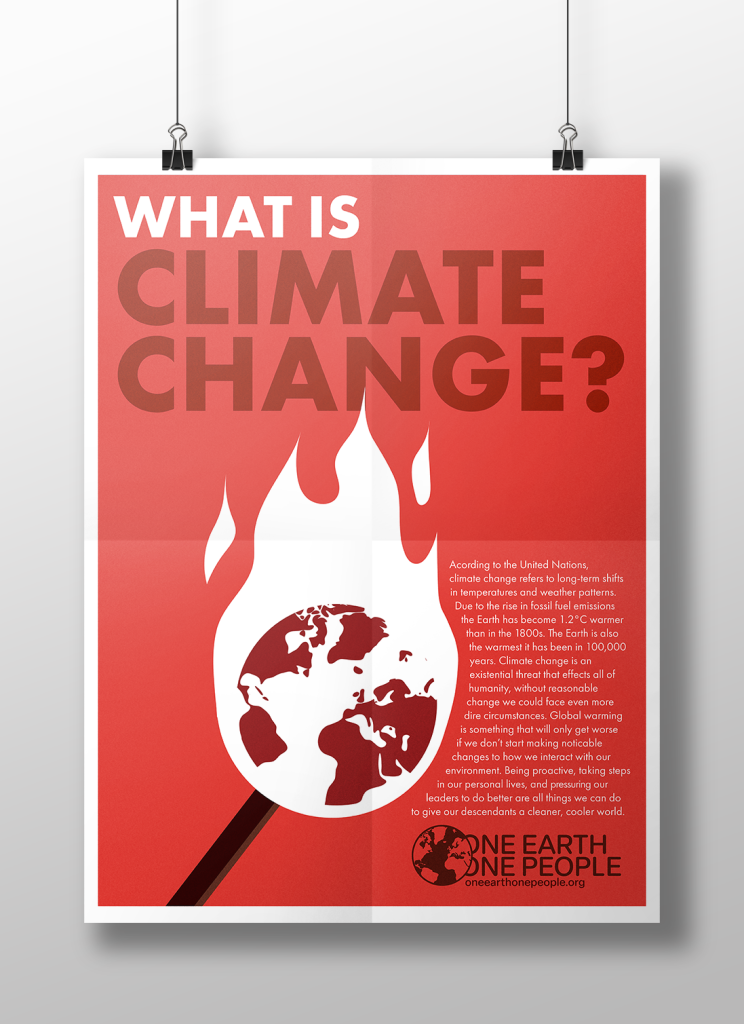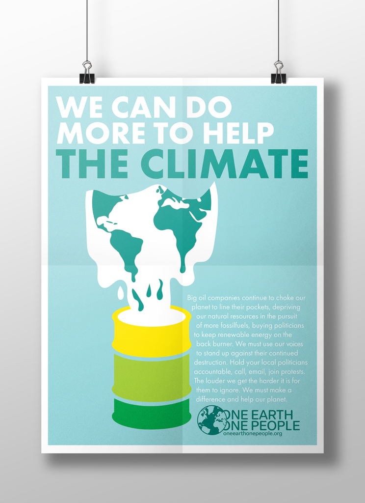One Earth One People was my project for my Junior capstone class. We were tasked with creating a multimedia campaign that would bring awareness to a social, political, environmental, or other issue that was apparent at the time. I chose to focus on global warming, to bring awareness to what it is as well as what is causing it. I created a logo, posters, a billboard, a t-shirt, and a table tent that would be displayed at businesses who showed support to the cause.
